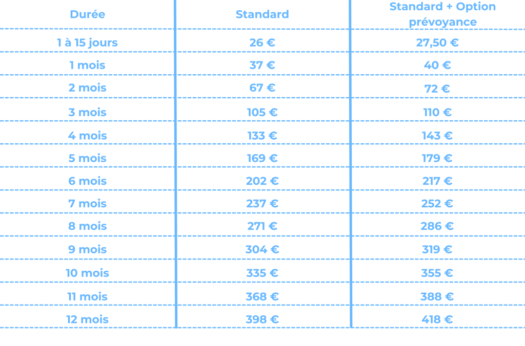Notre assurance voyage propose une option de prévoyance individuelle accident pour une protection supplémentaire. En cas d'accident, cette option assure une indemnisation complémentaire, offrant une sécurité financière pendant vos déplacements. À noter que cette option n'est pas obligatoire, vous avez le choix de la sélectionner ou non lors de la tarification.