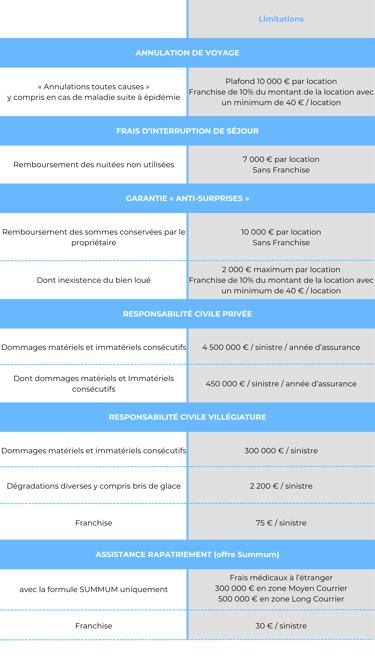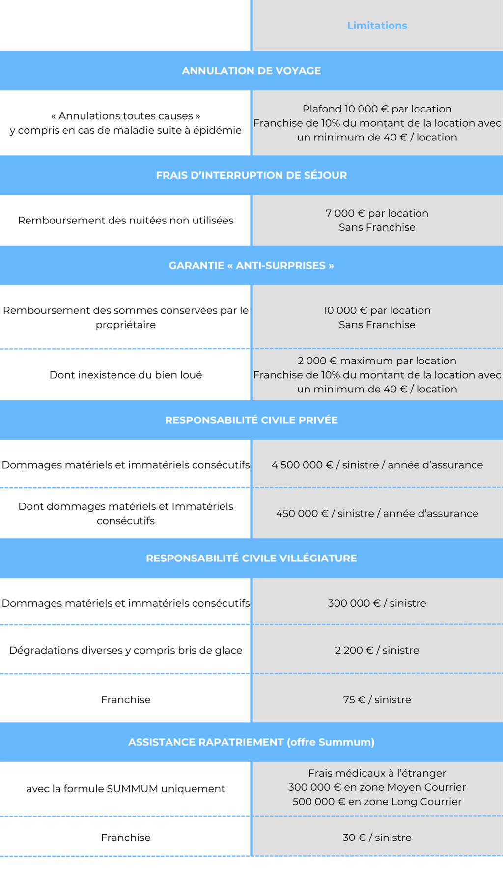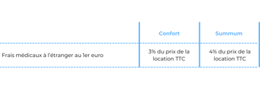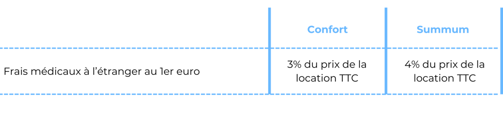 Le produit est proposé en deux options : Confort et Summum. Si votre location est à l'étranger, nous vous recommandons vivement l'option Summum, qui inclut une garantie assistance/frais médicaux couvrant les épidémies.